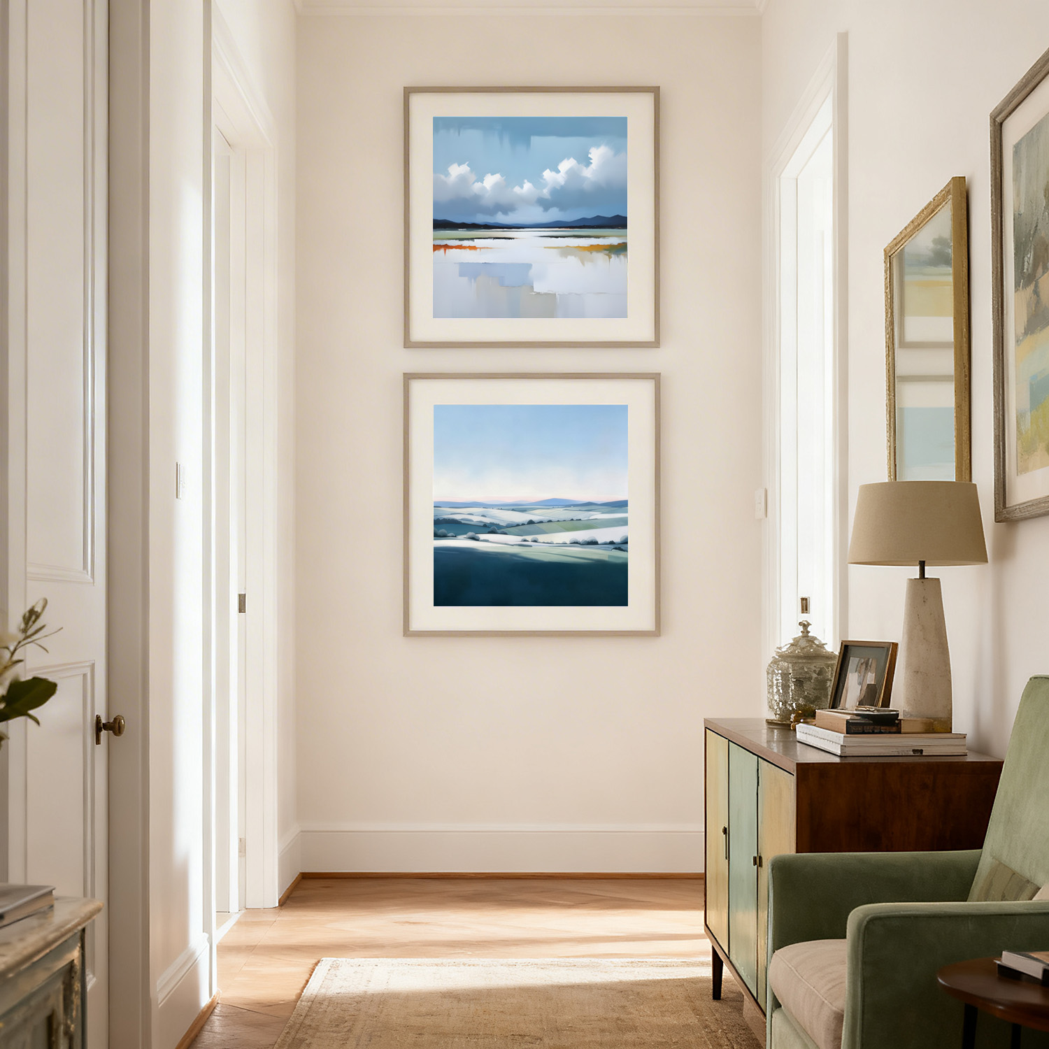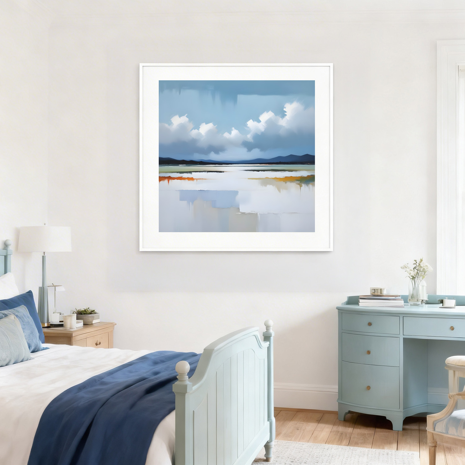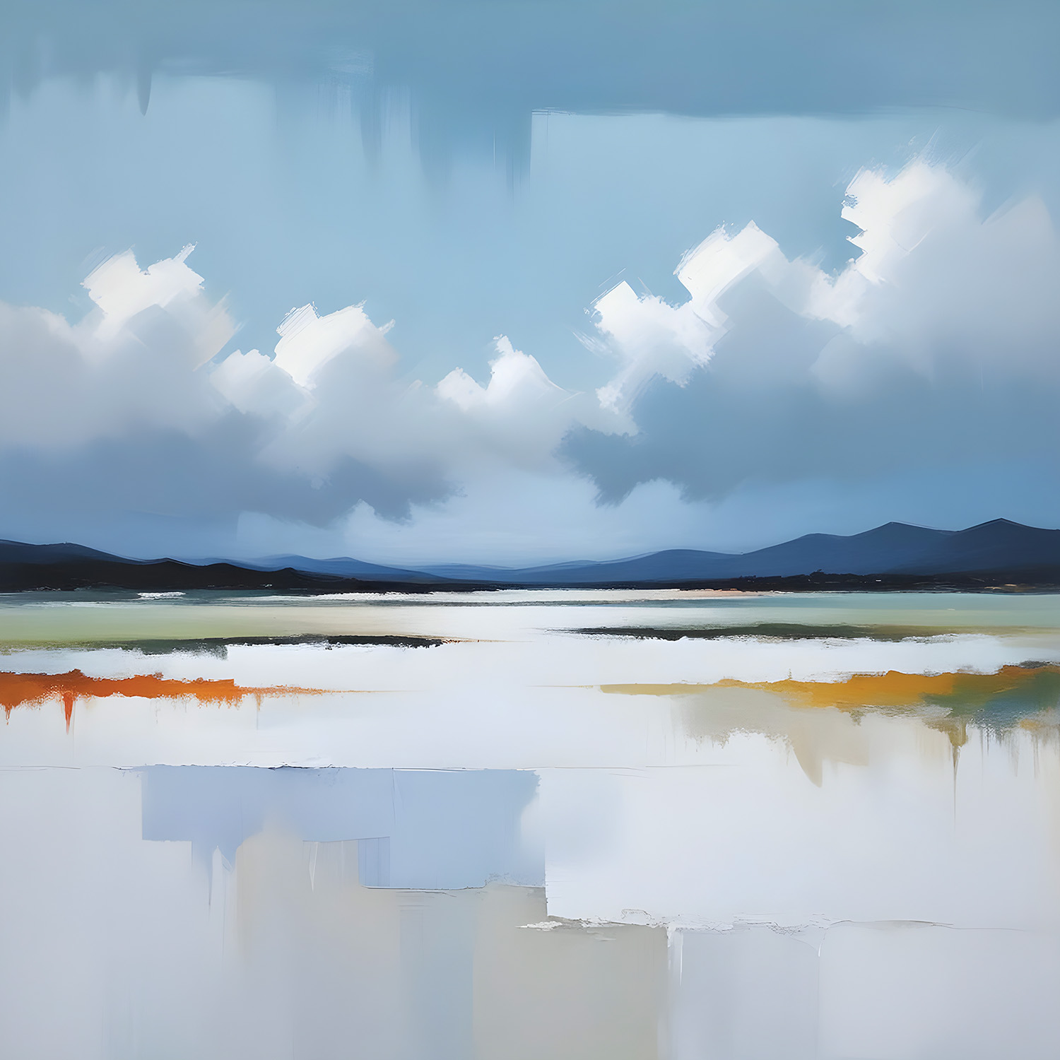 Even on a Dull Day is a Limited Edition Fine Art Abstract Landscape Print inspired by quiet moments beside the water. This artwork shows soft blues in the sky, drifting white clouds, and gentle, muted greens and ochres that hint at reflections on the water’s surface. There are touches of warm orange and calm greys throughout, giving a sense of stillness and light, even when the weather is subdued. My style is simple and honest, focusing on how light and colour can lift the mood.